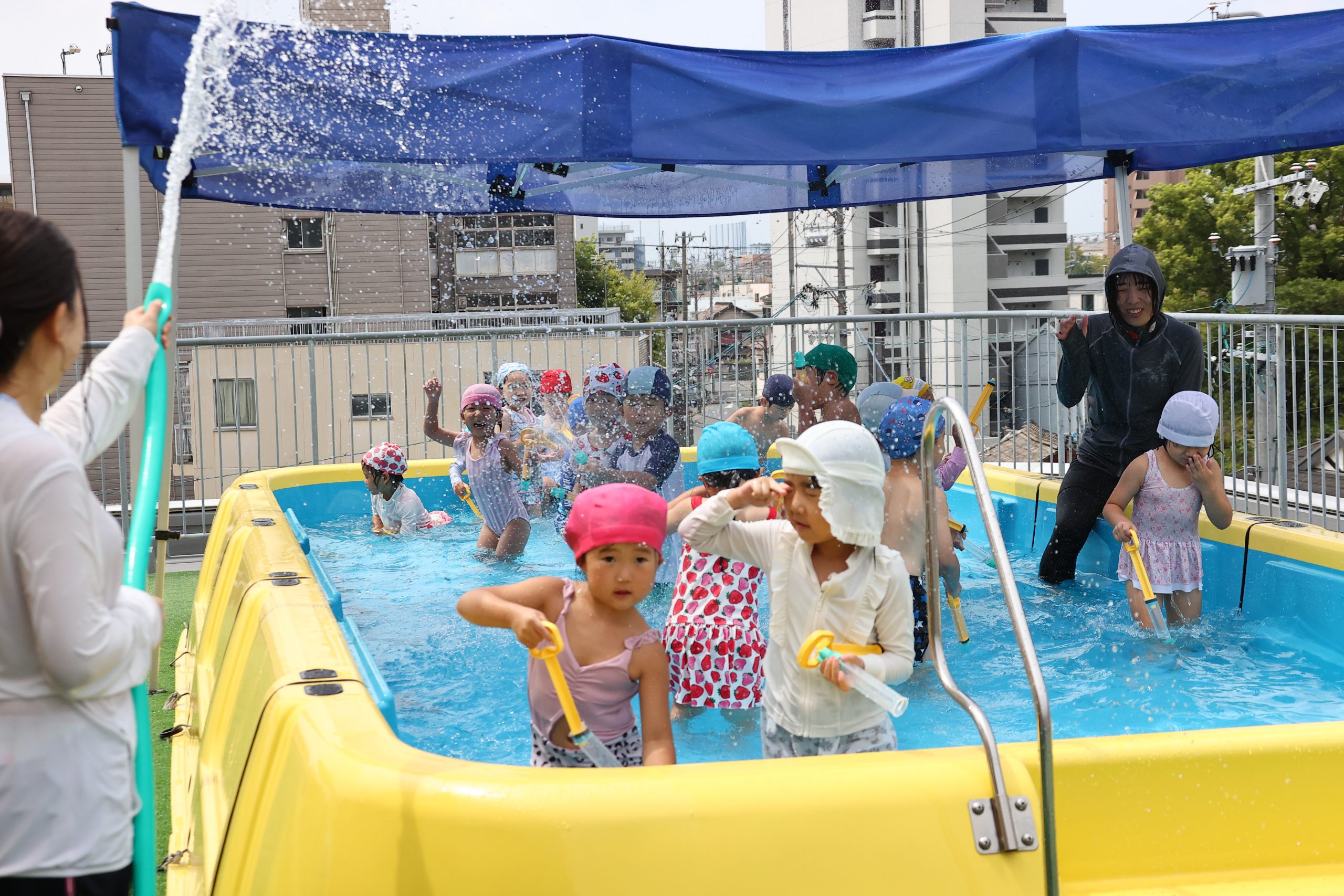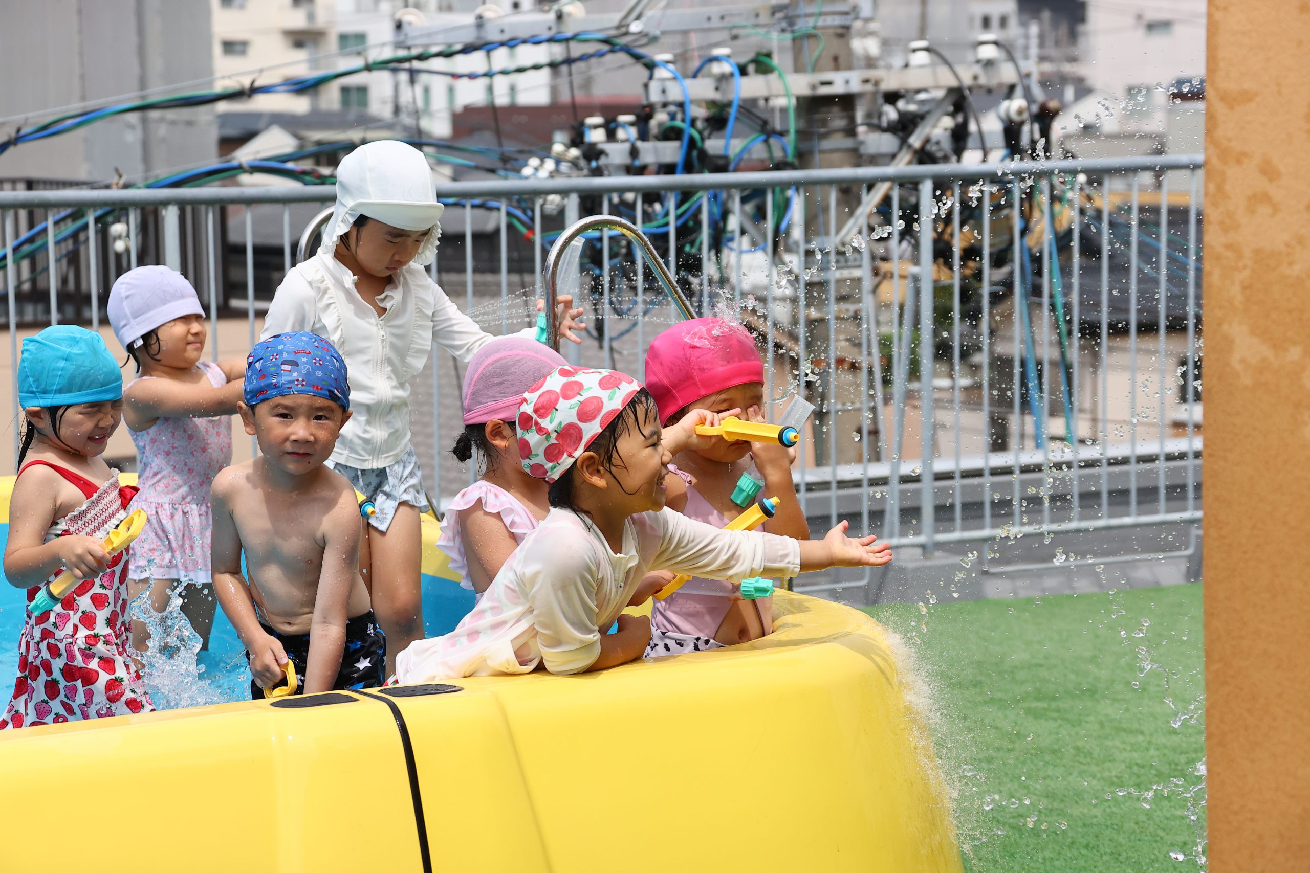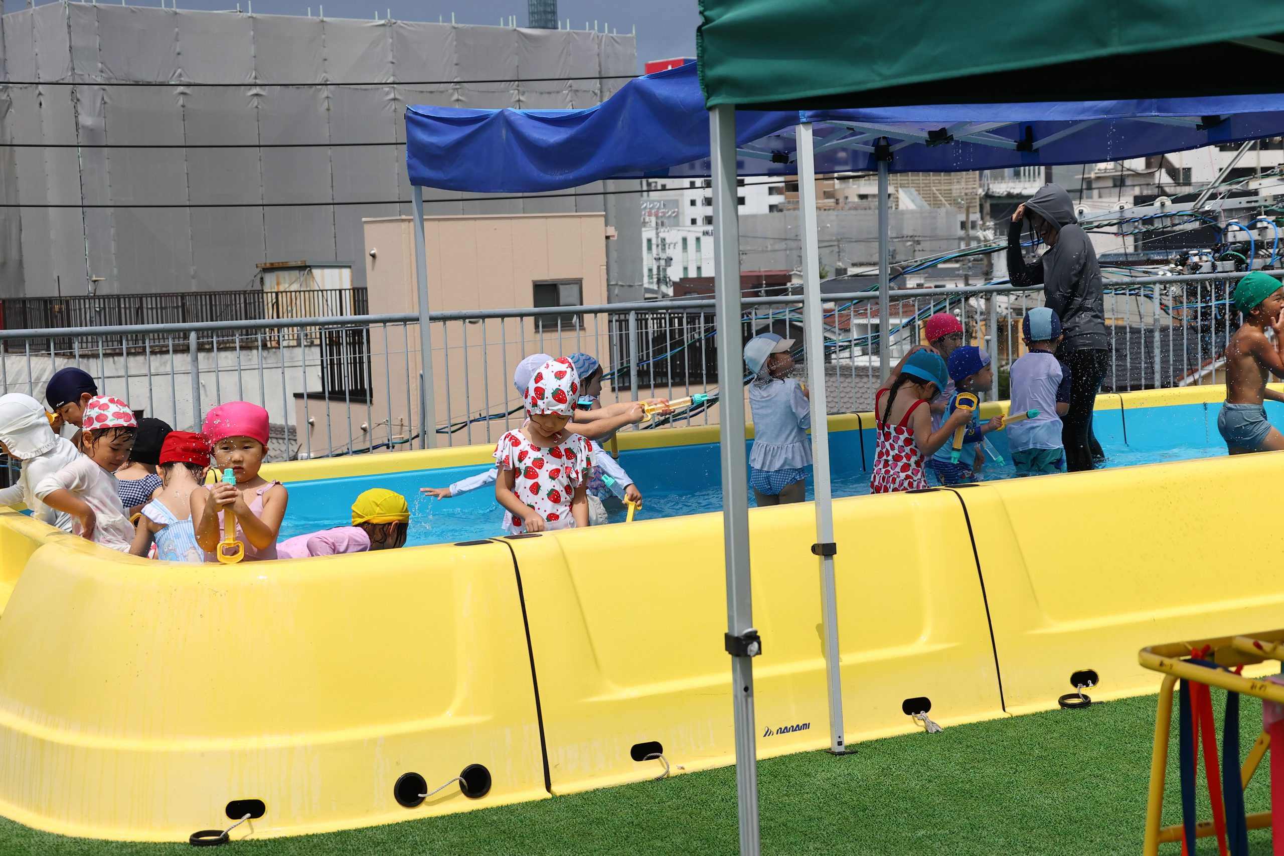 他にもバタ足や宝探しをして楽しみました。水鉄砲を使って遊ぶ自由時間では大喜びな子ども達!!水鉄砲で的当てゲームをしたり、先生や自分の足に水をかけたりとにぎやかな声が響きわたり、笑顔いっぱいのプール遊びの時間です。