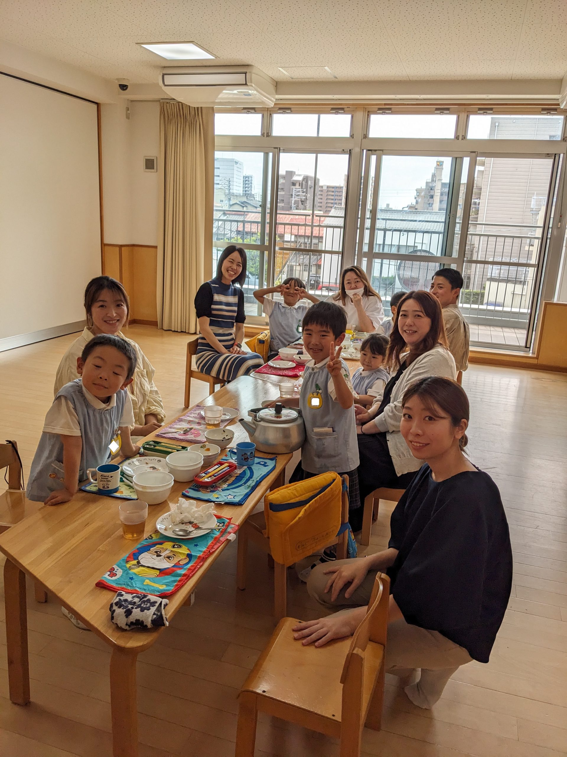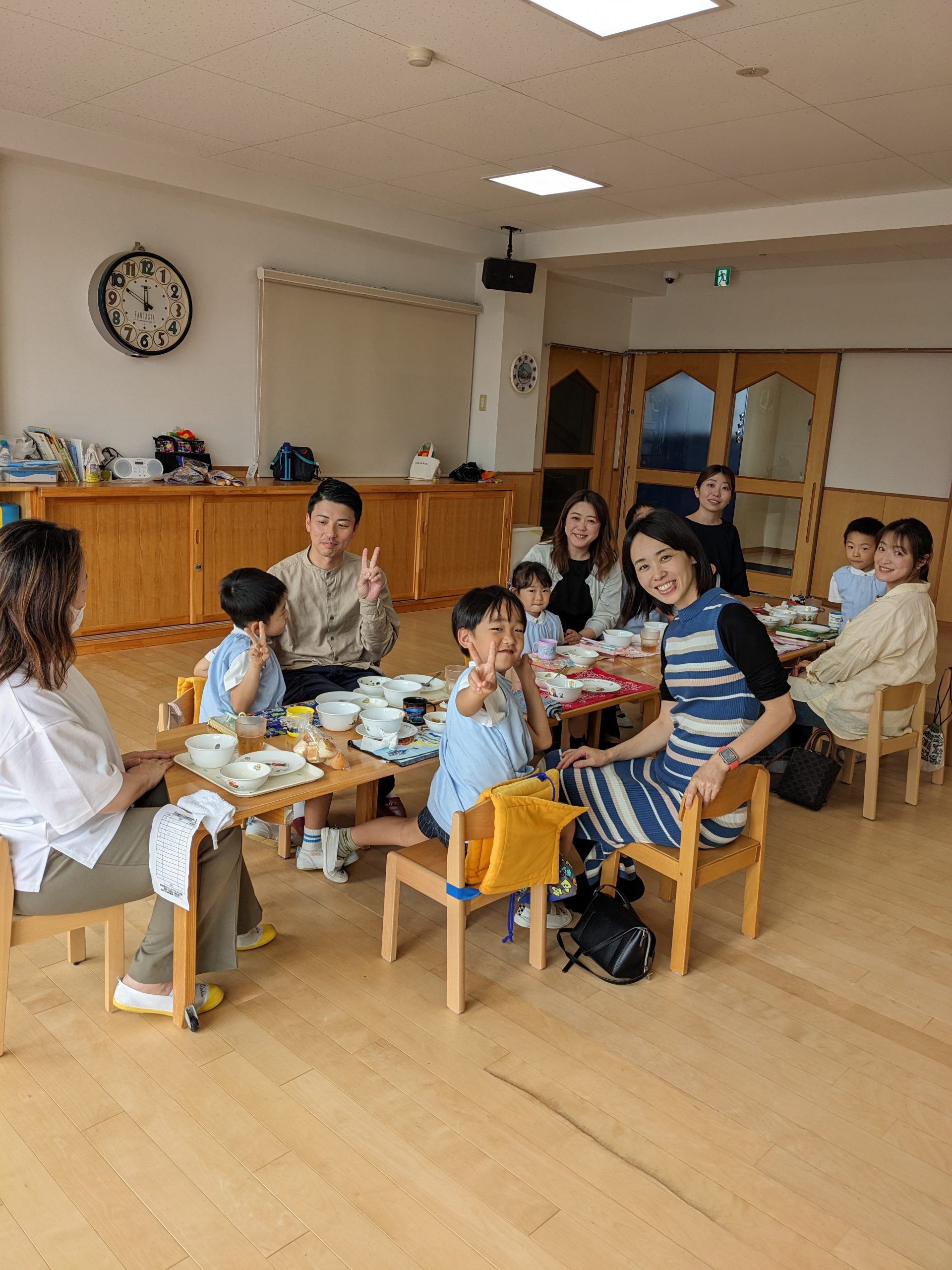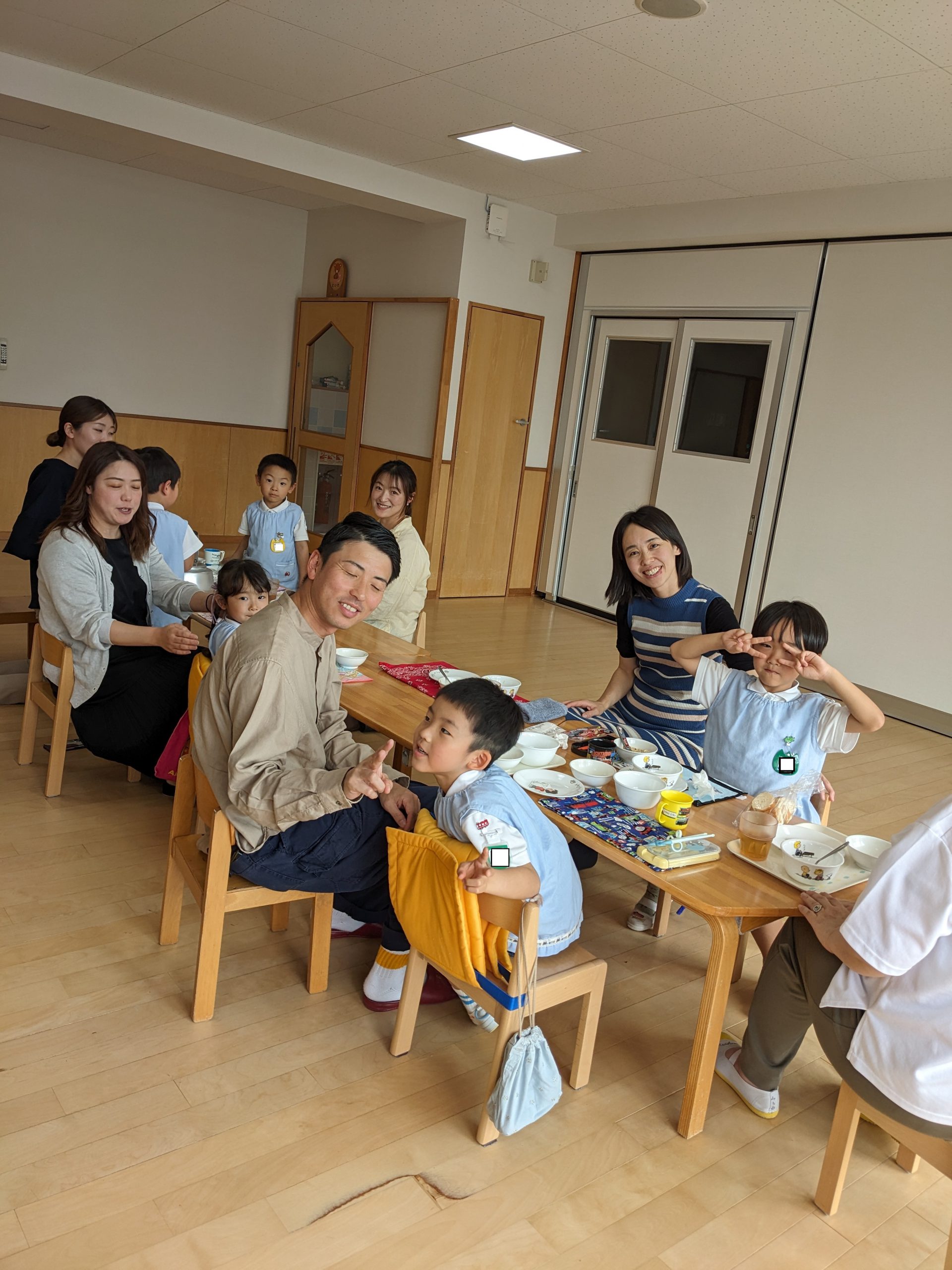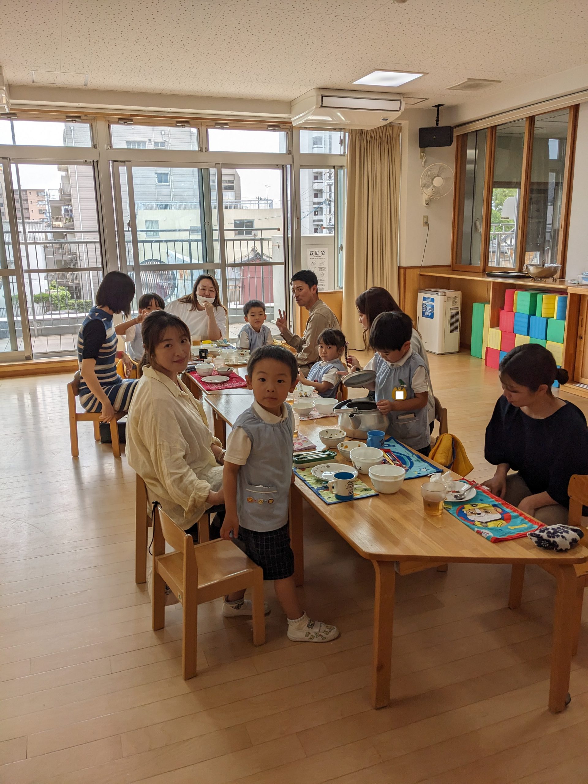 今年度初めての誕生日会終了後、梅・菊の親子給食試食会を行いました。本日のメニューは「チャンプルーと春雨スープとロールパン」でした。梅組2組、菊組3組の計5組の親子で3Fのホールで給食を頂きました。子どもたちはいつもは教室で給食を食べますが、試食会では保護者と一緒に同じメニューを3Fホールで食べられてとてもうれしそうでした。みんな、お誕生日おめでとう。