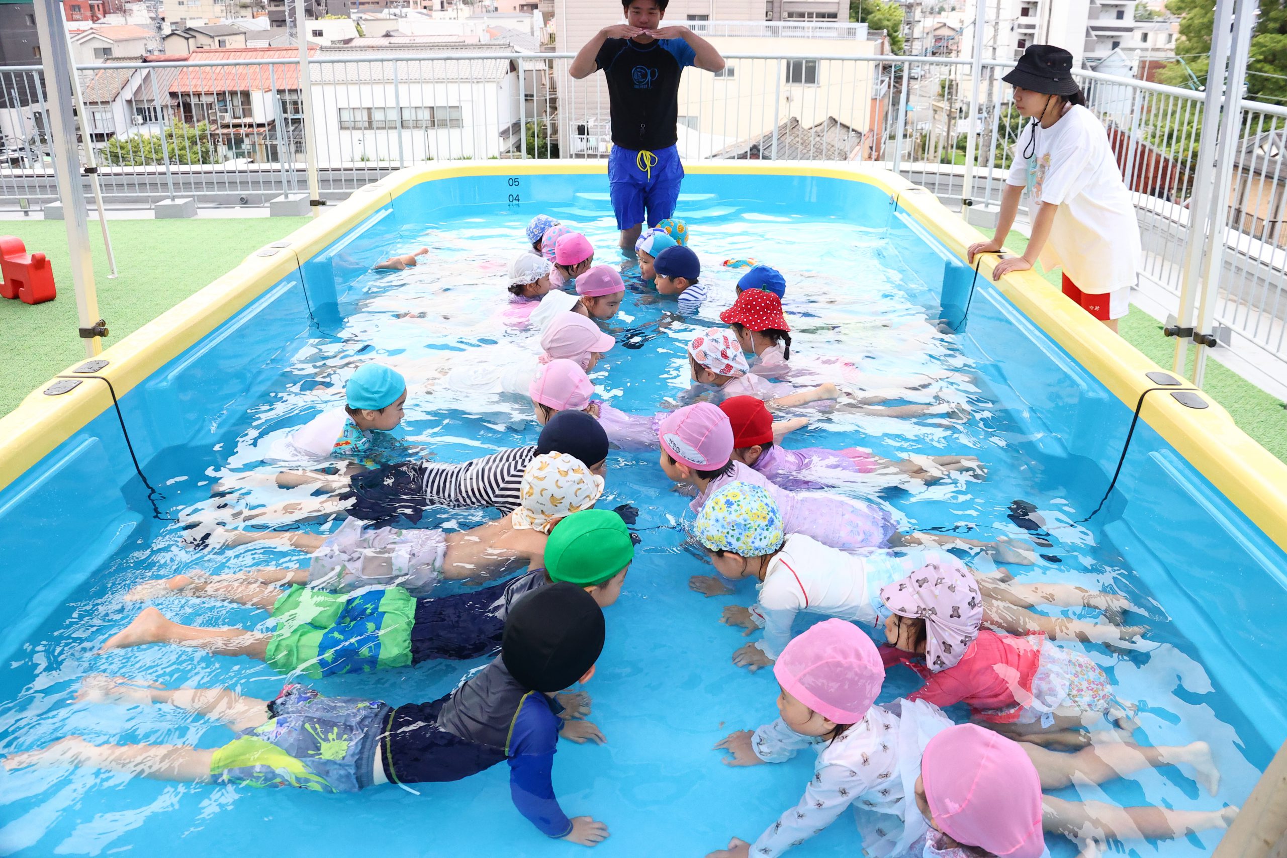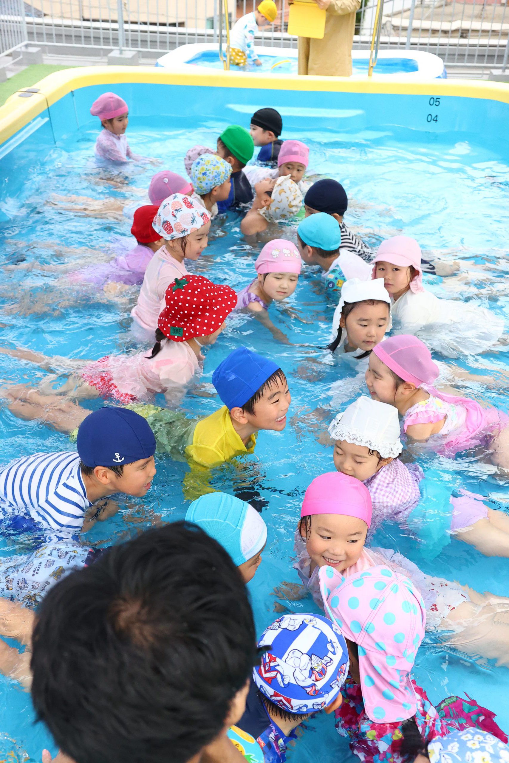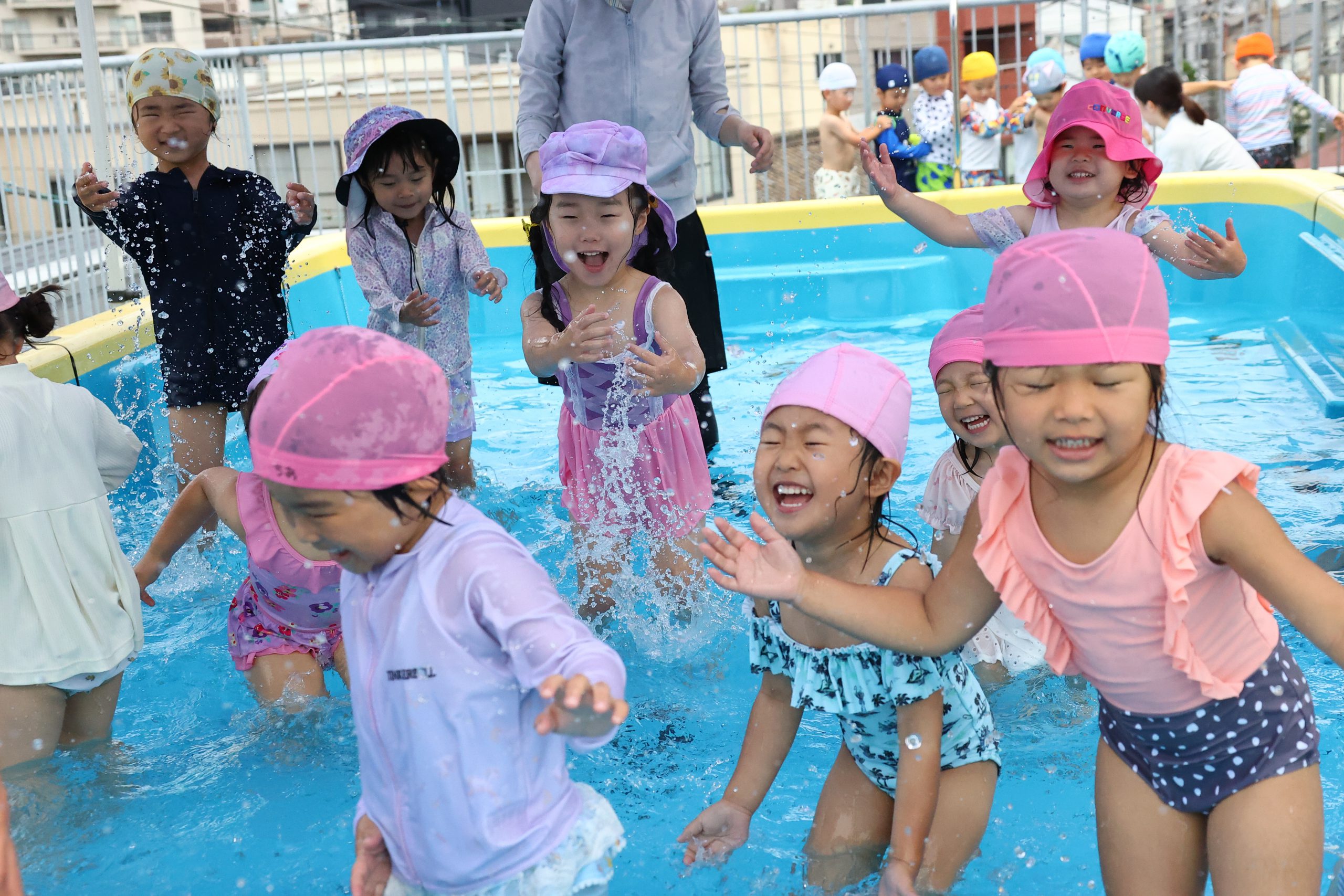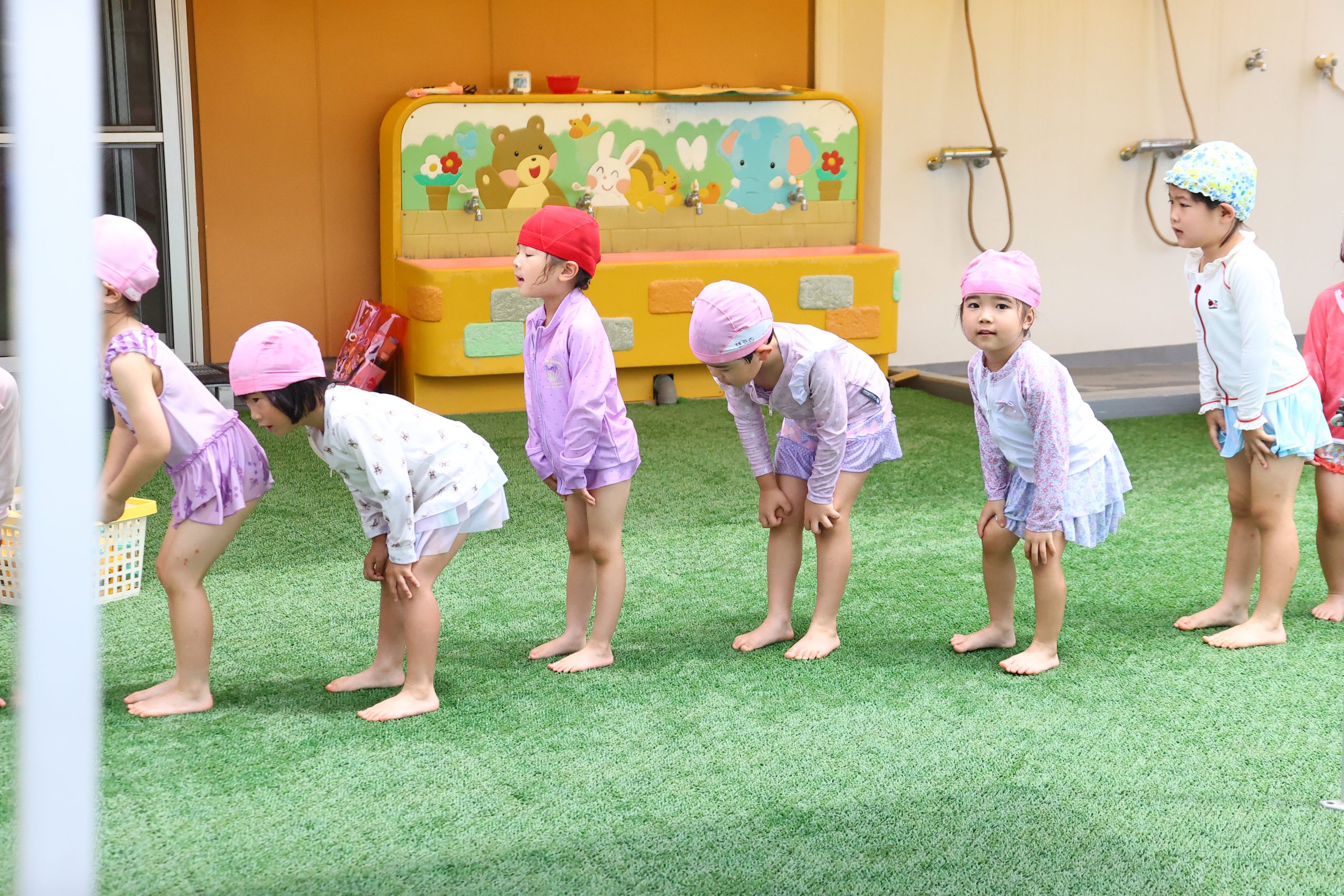七夕なつまつりが終わると、ひおき保育園のプール開きです。初日は幼児クラスが入りました。プール日和のお天気に恵まれ、屋上にあるプールではとっても楽しそうな子どもたちの声が響き渡っていました。「つめた~い!」「顔付けできたよ~!」と、それぞれ水遊びを楽しんでいて、プールを楽しみにしてくれていることが分かりました。8月末までのプール期間、プール遊びを思う存分楽しんでもらえたらと思います!
