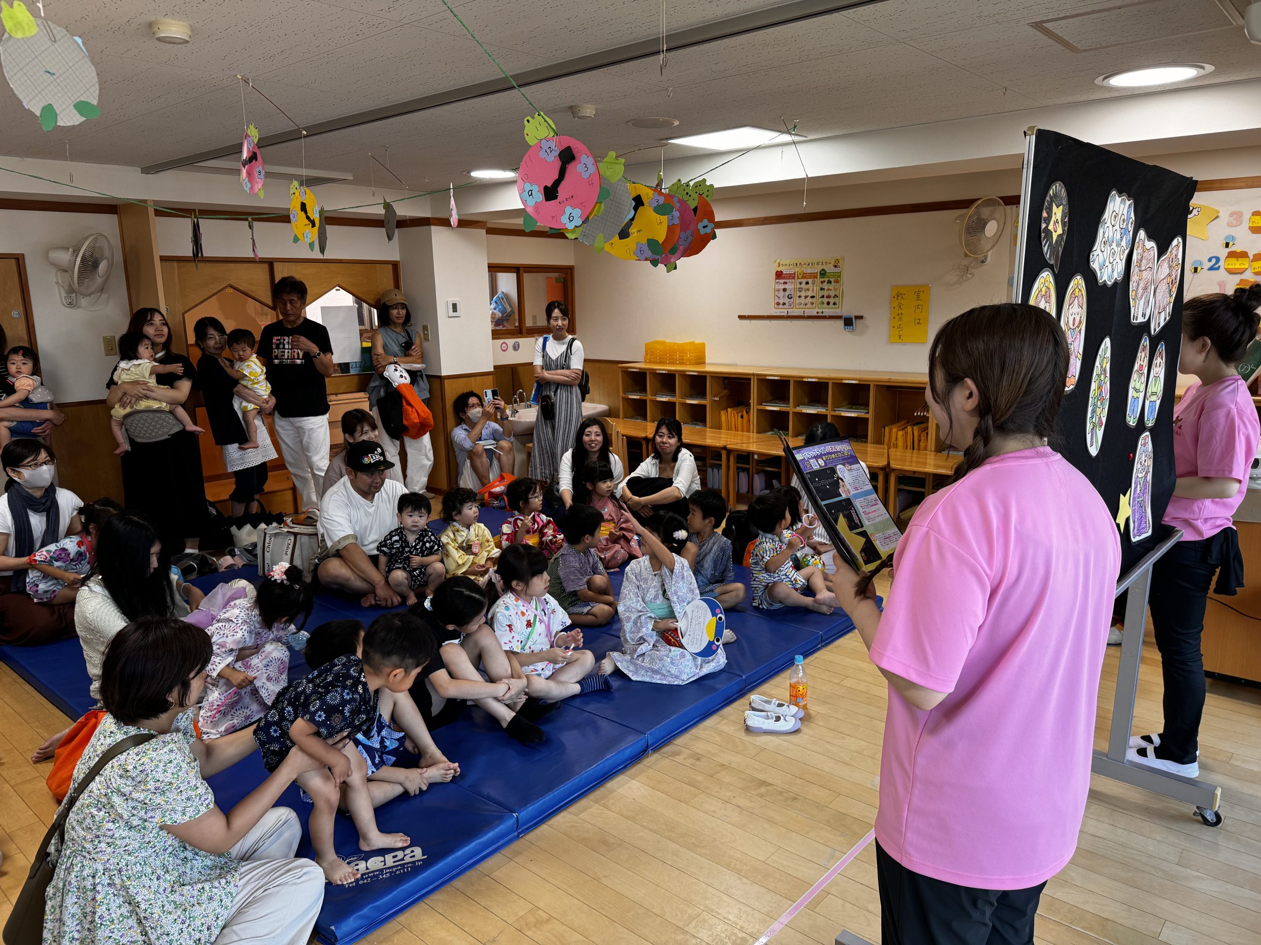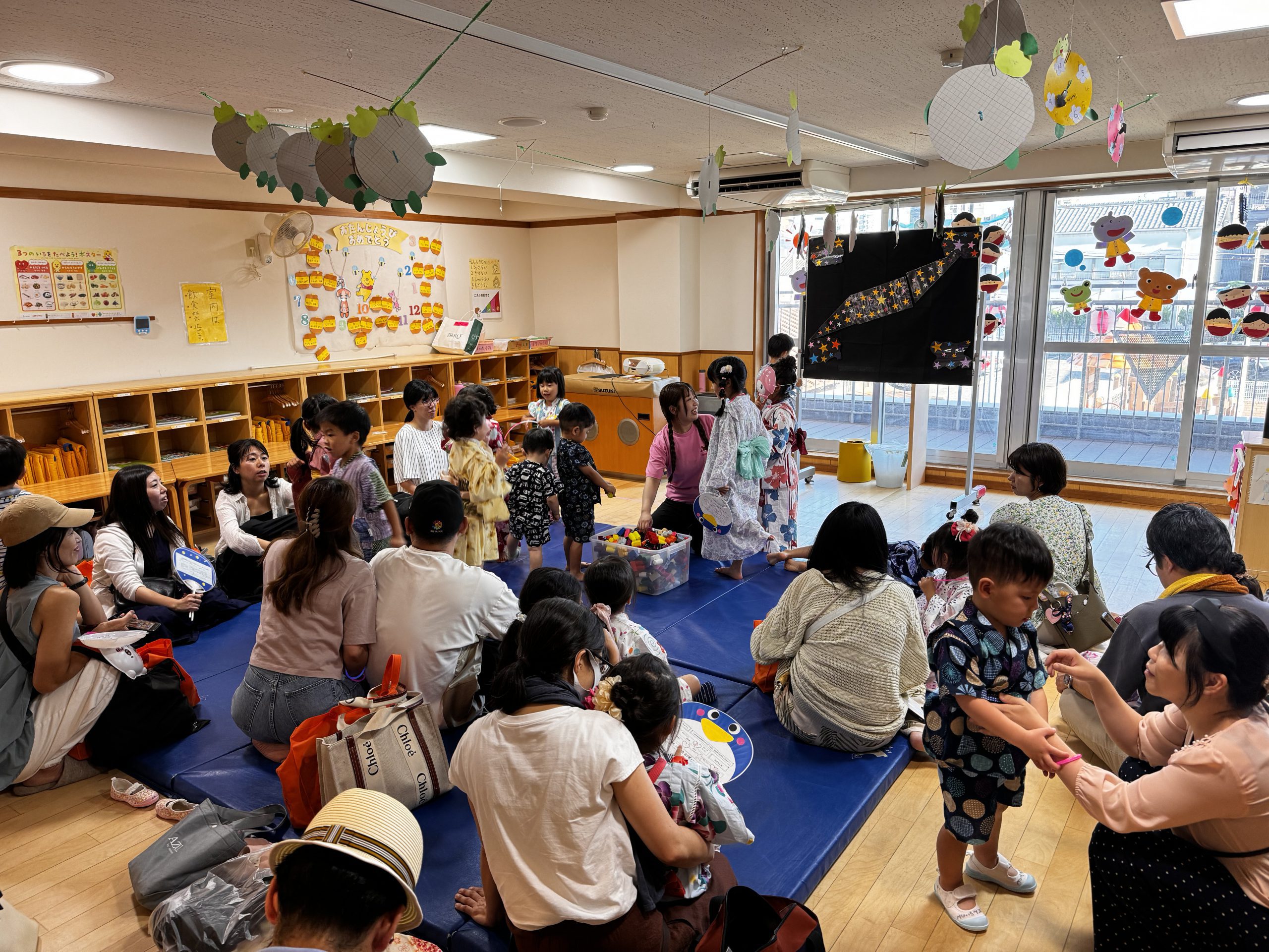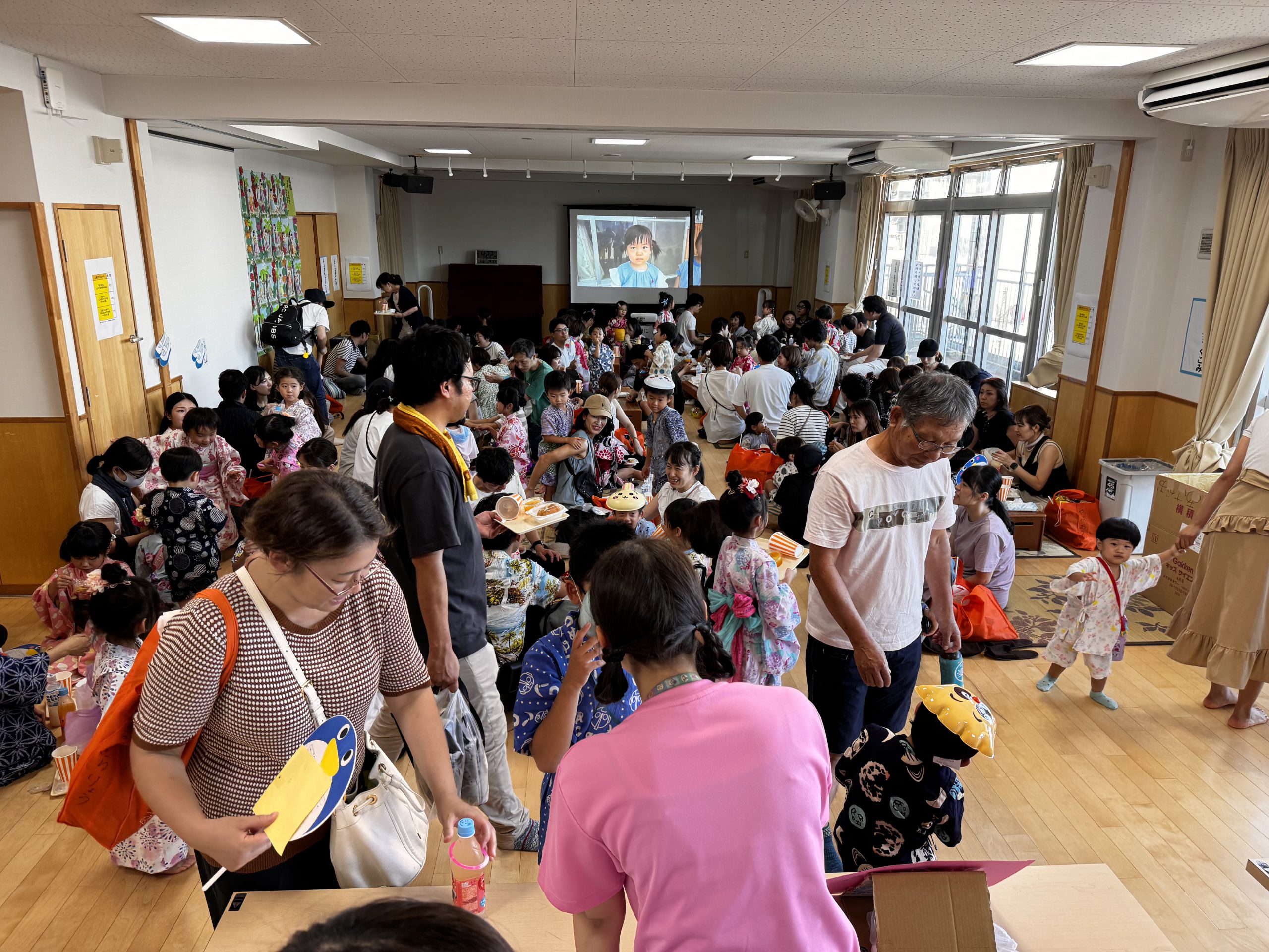 午前は幼児クラスによる盆踊りを行いました。非常に暑い日でしたので、急遽屋内での開催になりましたが、みんな可愛らしい浴衣・甚平姿で盆踊りを披露してくれました。どのクラスの子どもたちも練習の成果をしっかりと発揮できていました!