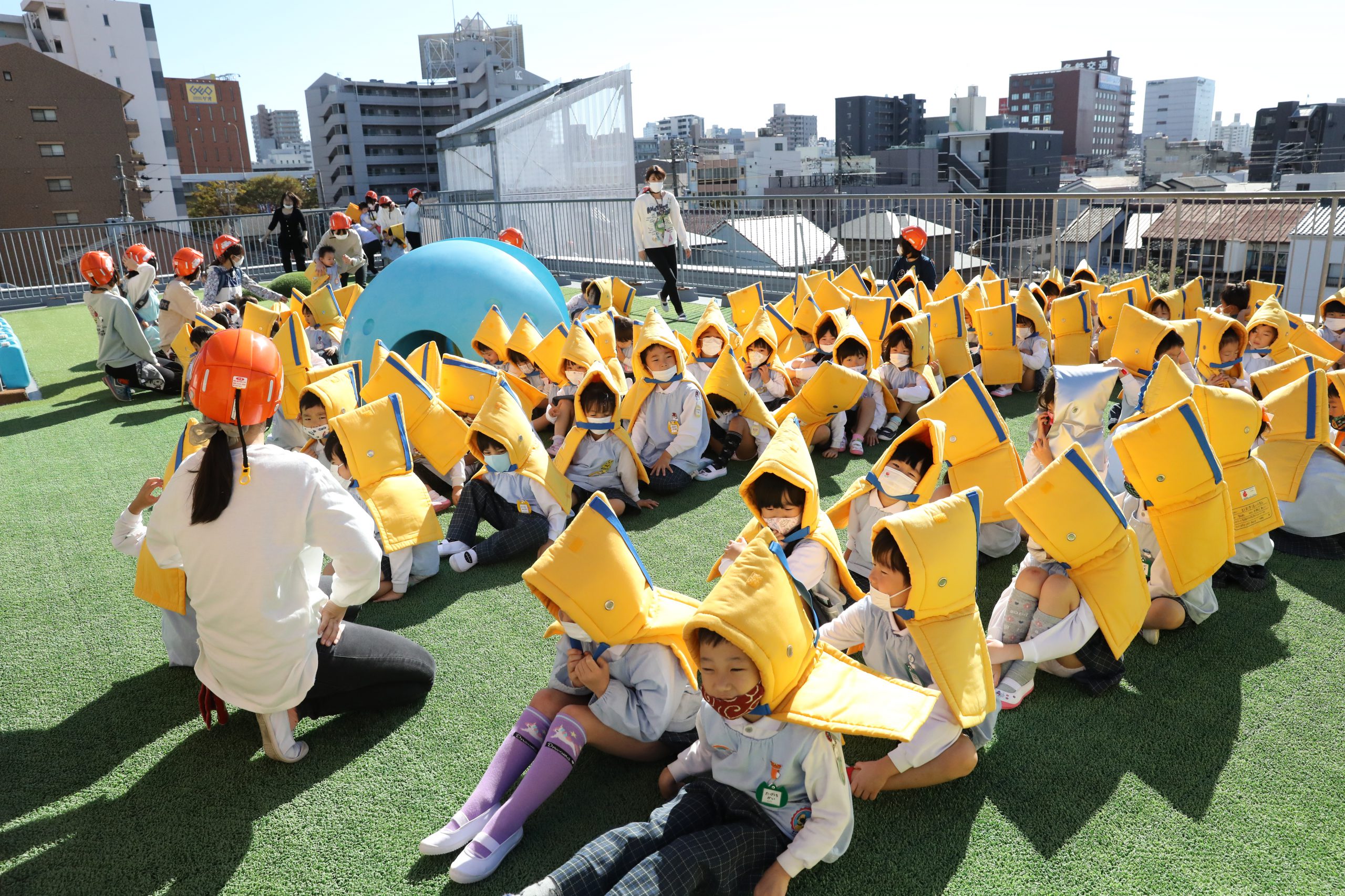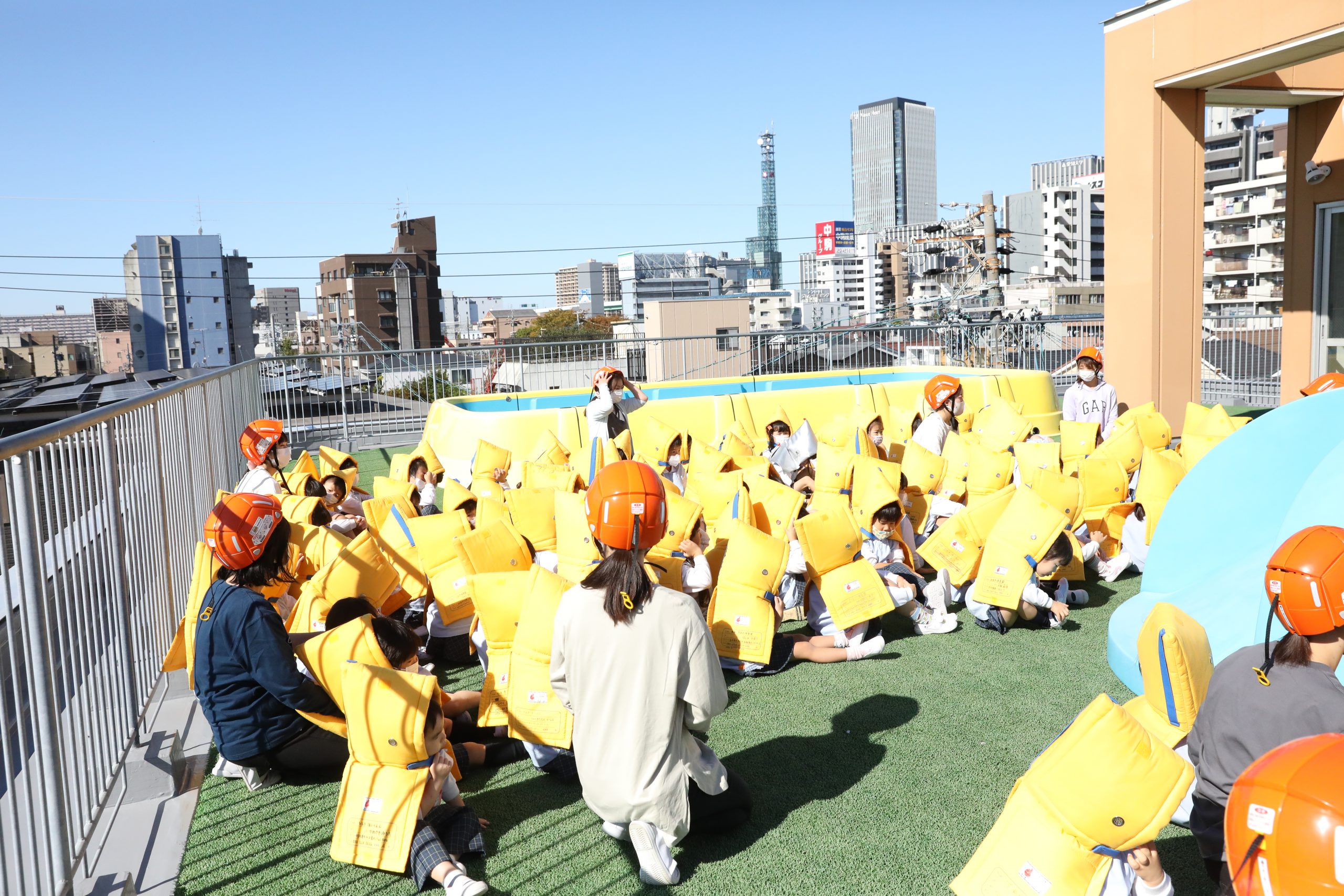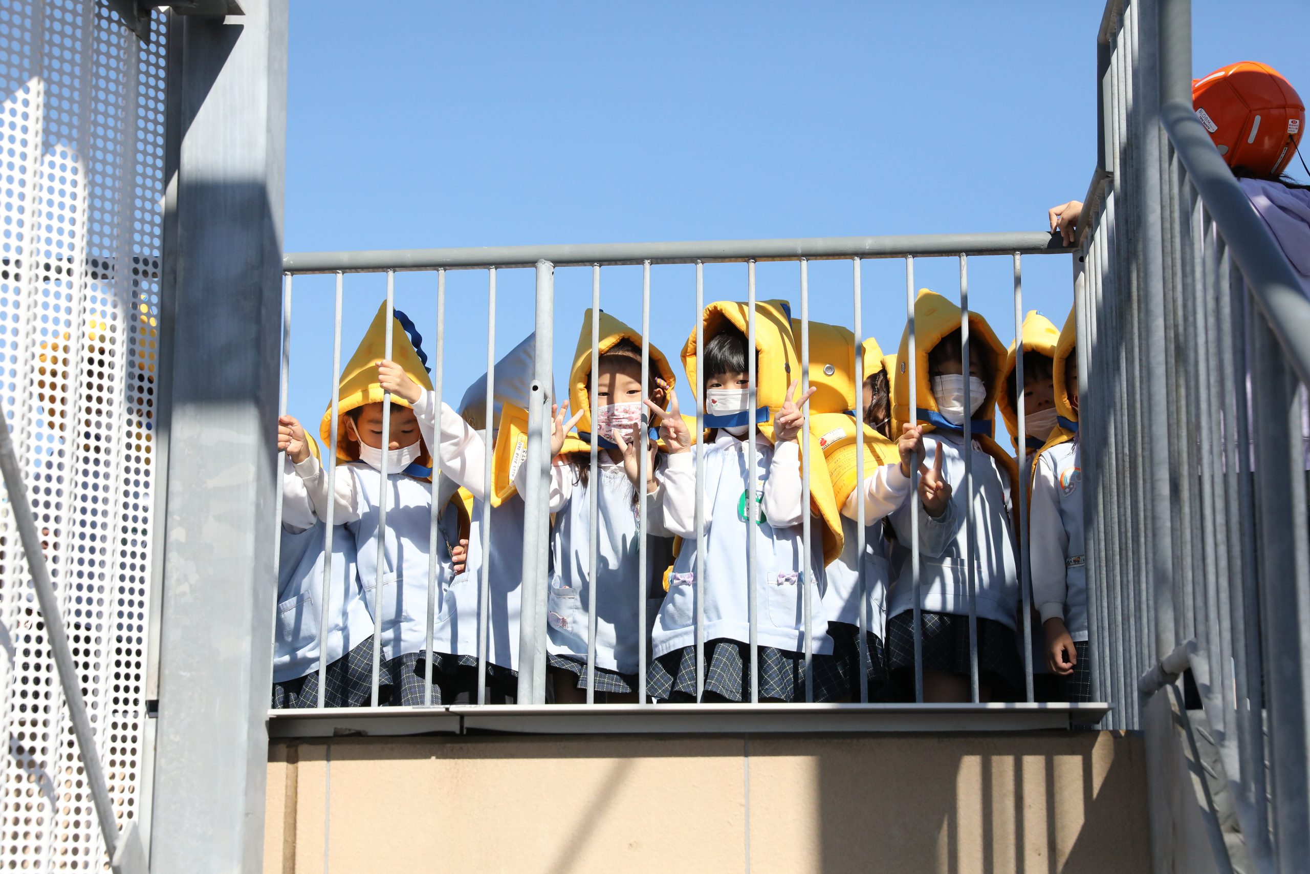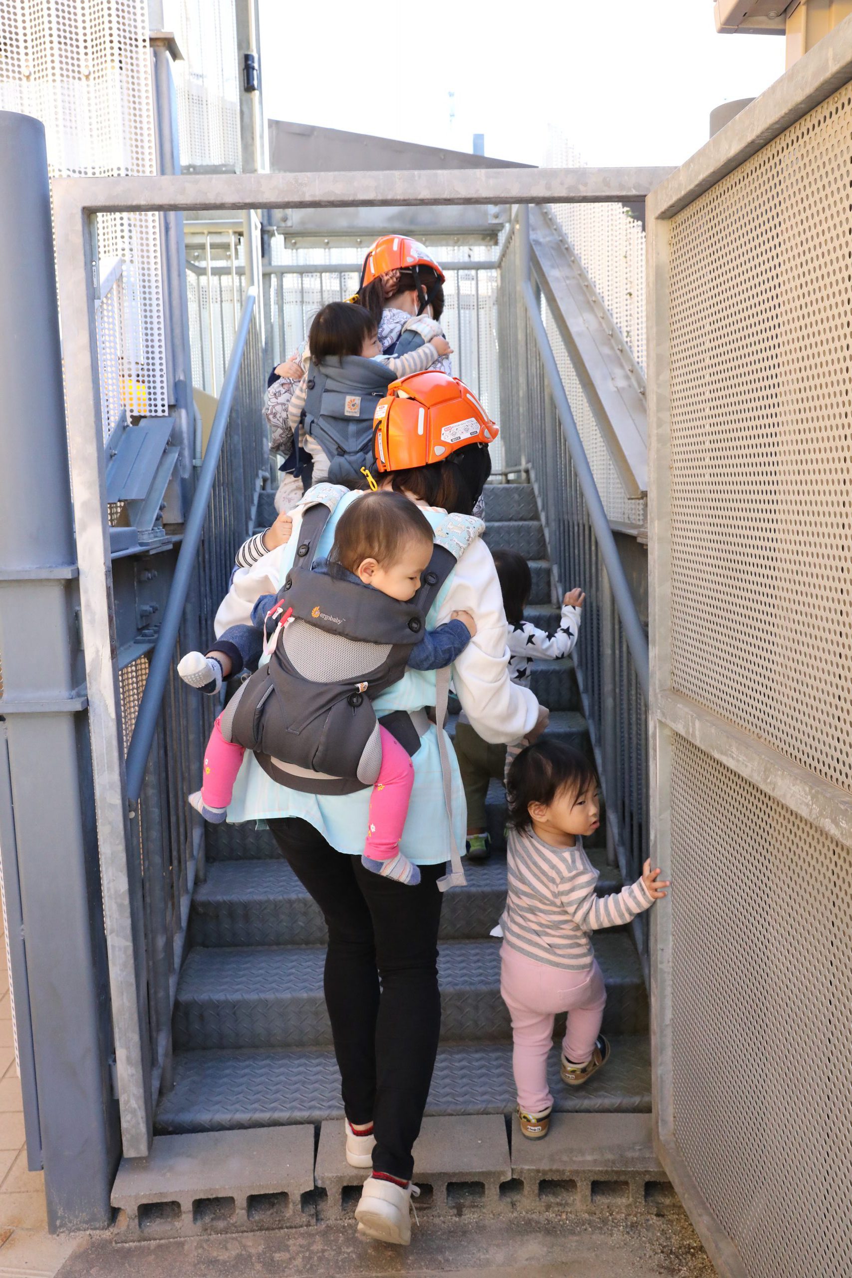 全園児が4階屋上へ避難し、乳児は保育士が抱っこひも等で抱きながらの避難です。こどもたちは使い慣れない非常階段での移動に驚いていましたが落ち着いて屋上まで避難していました。保育園の場所的には万が一津波が来ても時間に余裕があるため落ち着いての避難が大事です。